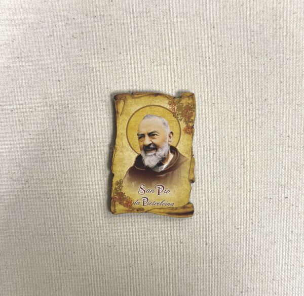 Wooden magnet with image of Saint Pio, embossed with gold foil; made in Italy.