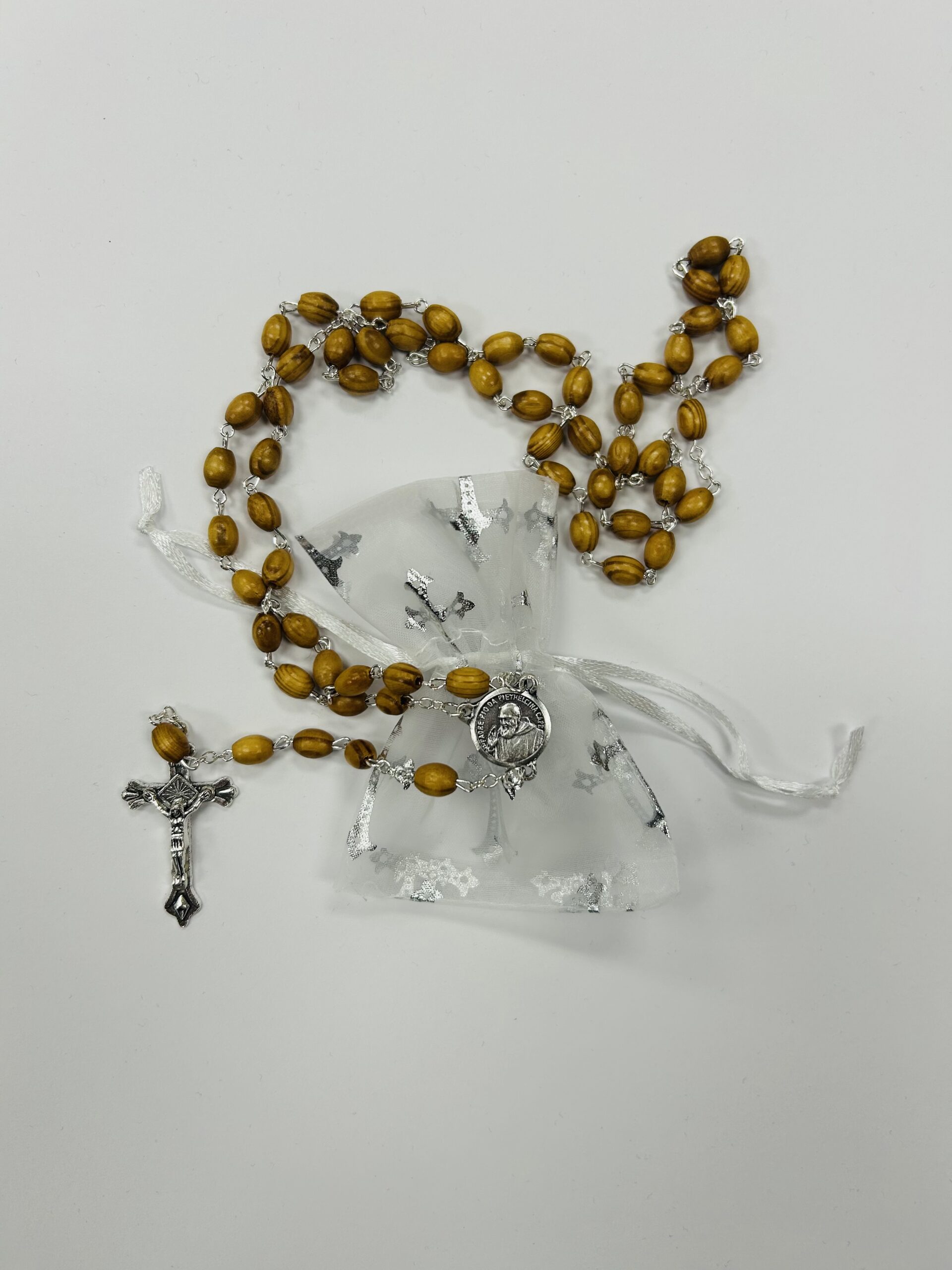 Beautiful olivewood bead Rosary with Relic of St. Pio on reverse of center medal. Made in Italy.
