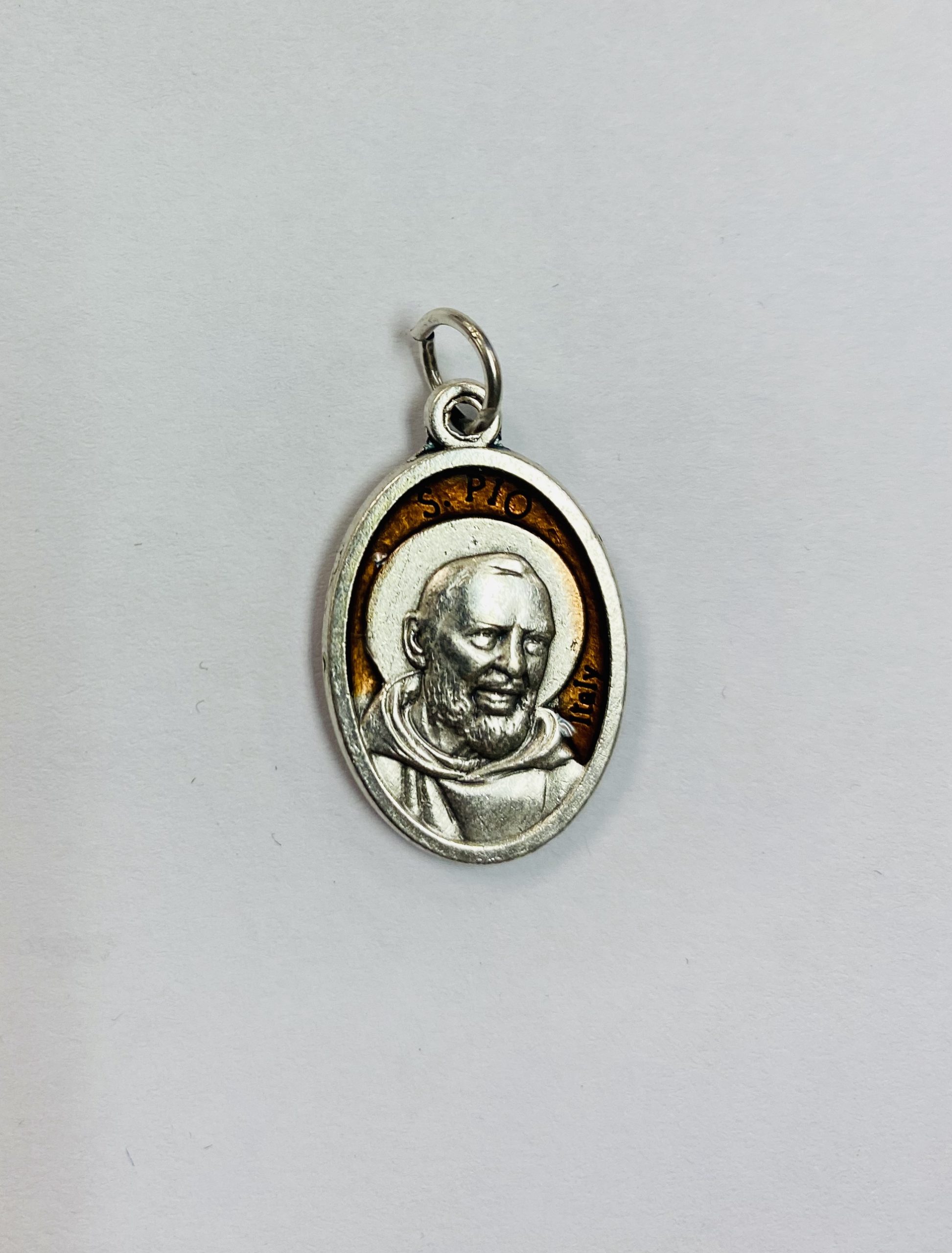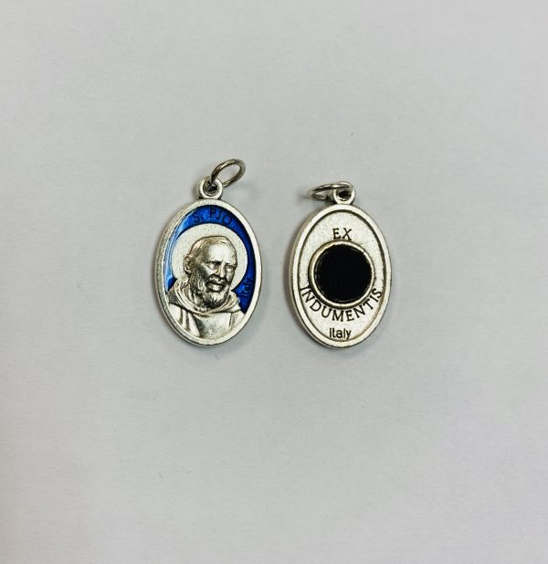This third-class relic medal includes St. Pio on the front and a relic on the back.