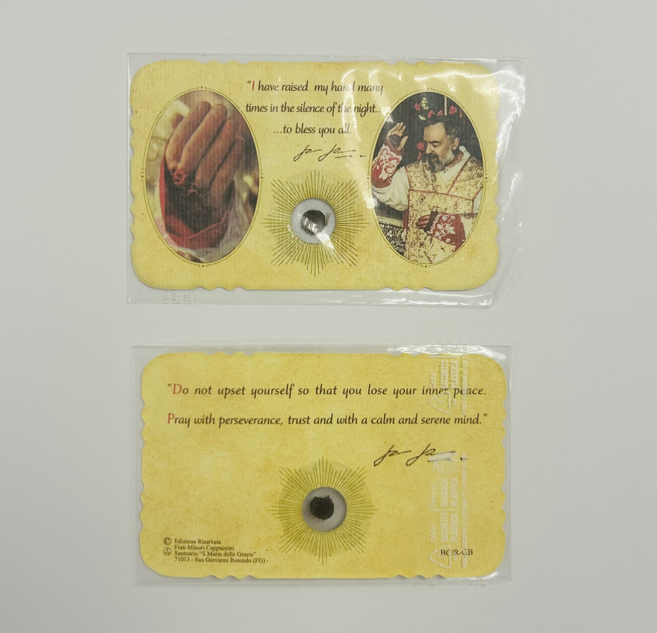 This prayer card comes from San Giovanni Rotondo, and includes a third class relic of Padre Pio; comes in protective sleeve.
