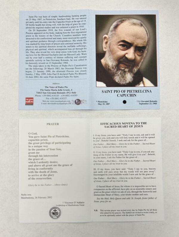 This Relic leaflet contains a third class relic, along with the Efficacious Novena to the Sacred Heart of Jesus and the Prayer to St. Pio – English language ONLY