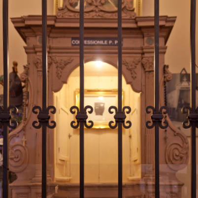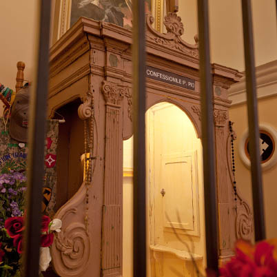 The last side altar on the left side of the chapel houses an actual confessional used by Padre Pio, in San Giovanni, to hear the confessions of the women. It is ironic that this confessional would be the one to find its way to America through the efforts of one woman who wanted to thank the holy stigmatist for healing her daughter. Because of the confessional’s historic significance and sacred nature, it is surrounded with a black wrought iron fence to protect it from harm.